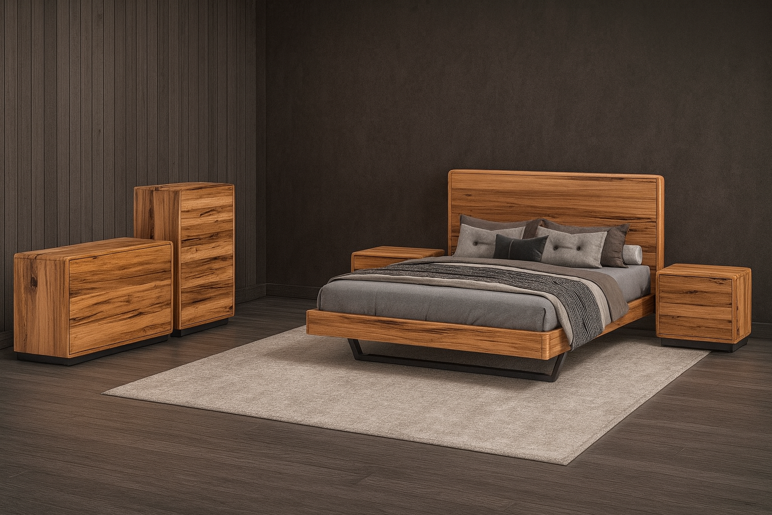 LYON AUSTRALIAN FIGURED OAK HARWOOD BEDROOM COLLECTION. Floating foot-end design, dovetailed, and solid velvet lined drawers, and full-extension runners. A modern sophisticated bedroom suite.
